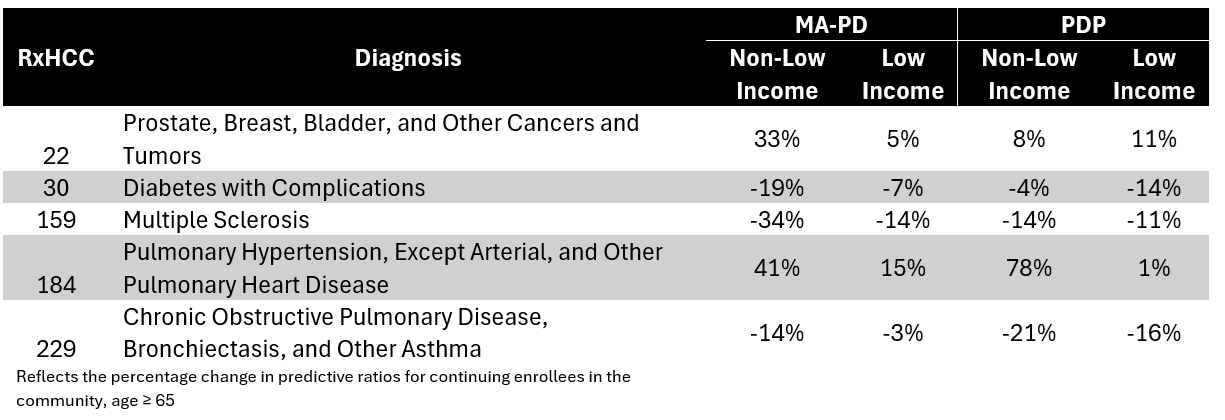 - The extent to which the updates will affect the delicate balance between actual plan costs and payment amounts for MA-PDs vs. PDPs, especially for the diagnoses most impacted.