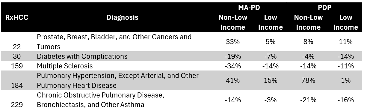 - The extent to which the updates will affect the delicate balance between actual plan costs and payment amounts for MA-PDs vs. PDPs, especially for the diagnoses most impacted.