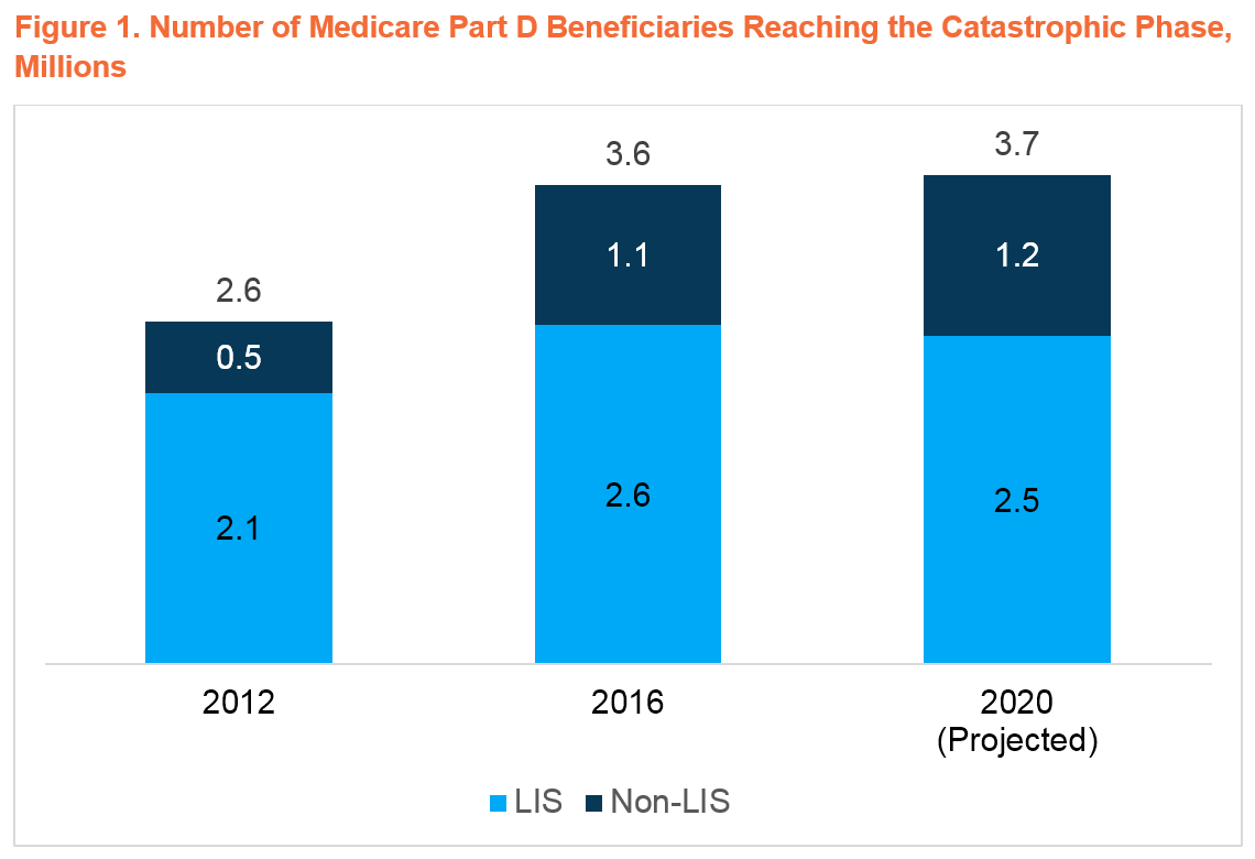 Due to the rapid growth in catastrophic spending, policymakers have increasingly focused on ways to manage these costs and limit beneficiary exposure to high cost sharing in Part D. Currently, the catastrophic phase is designed so that beneficiaries who do not receive the low-income subsidy (LIS) pay 5% coinsurance, while plan sponsors pay 15% of costs, and the Medicare program is liable for the remaining 80% through direct reinsurance. Of the 3.7M beneficiaries projected to reach catastrophic in 2020, 1.2M are not expected to receive the LIS, meaning that they are responsible for ongoing cost sharing in the catastrophic phase.