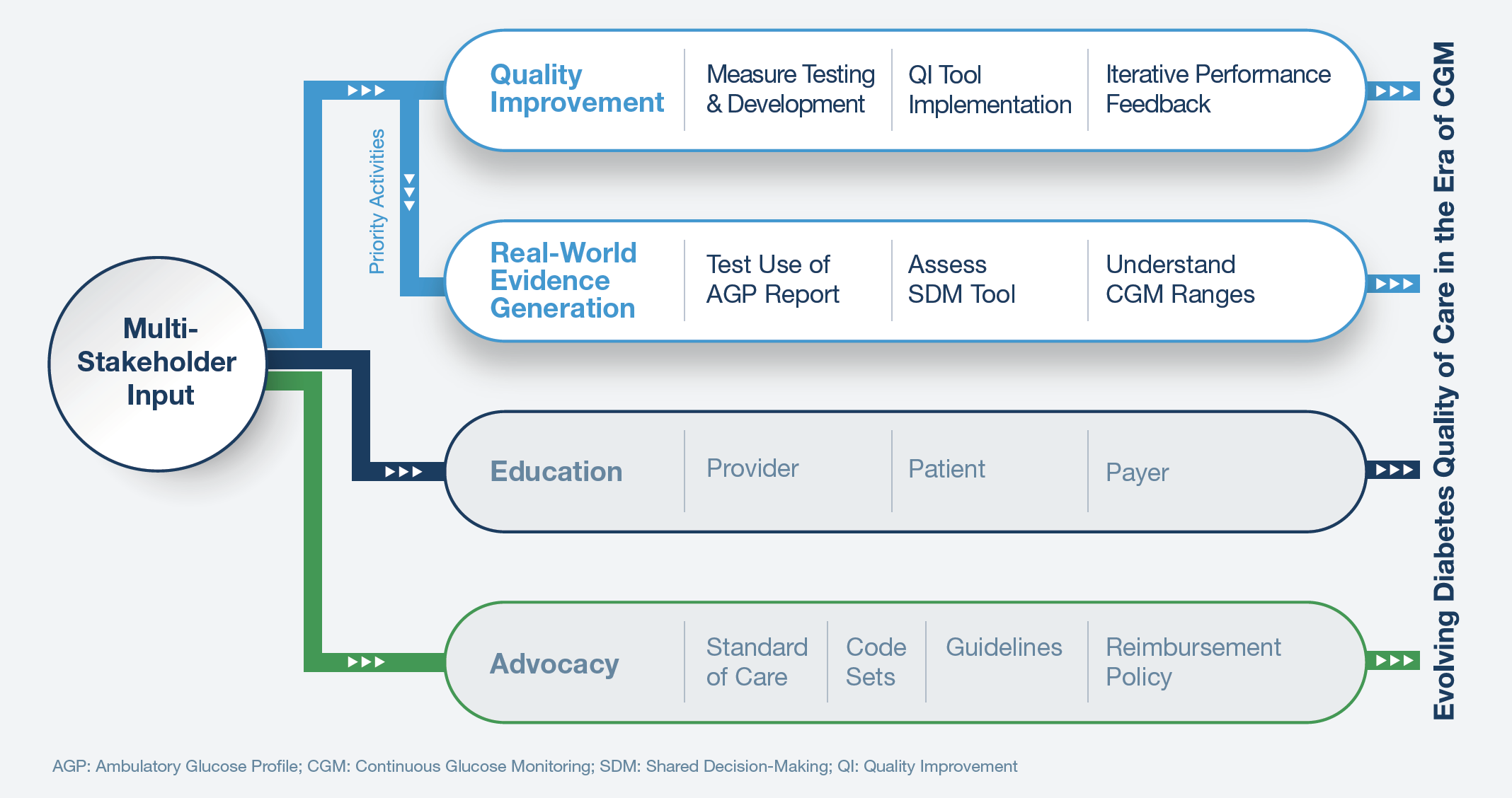 In 2021, diabetes stakeholders will partner to build upon these recommendations by launching the initiative and developing initial CGM-related quality measures. The goal of these and subsequent efforts will be to leverage input from diverse diabetes stakeholders to establish an initiative that advances the quality of diabetes care in the era of CGM (Figure 1).
