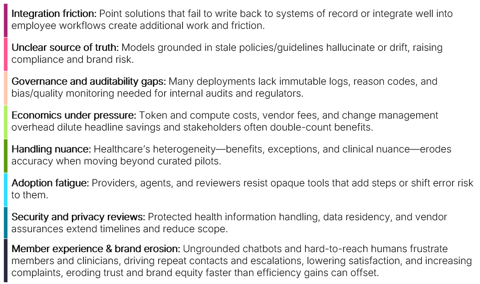 Over the next 12–24 months, expect fewer new program pilots and a shift toward structured, stage-gated evaluations of existing pilots. Initiatives progressing beyond pilot stage must demonstrate sustained improvement on a small set of enterprise metrics (e.g., member experience, cycle time, cost to serve) with credible attribution, audit-ready traceability, and integration into systems of record. Until tools provide such evidence, healthcare leaders should maintain a measured posture. Plans, providers, and PBMs should focus on targeted deployments in AI-ready workflows, define clear go/no-go thresholds, and maintain continuous monitoring while avoiding letting demonstrations drive broad rollouts.