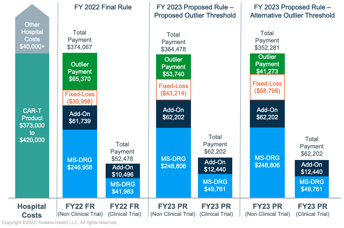 - Stability of MS-DRG 018: The proposed FY 2023 base rate for MS-DRG 018 is generally aligned with FY 2022 levels, though changes to the outlier threshold could result in overall decreases in payment. Total reimbursement will vary by hospital and case, with adequate reimbursement in some cases but with potential financial risk for hospitals on significantly costly cases. In the future, inclusion of additional immunotherapies that could be mapped to MS-DRG 018 may lead to fluctuations in the base rate. Several stakeholders have also submitted comments raising concerns about how the CMS would address an inpatient gene therapy that maps to MS-DRG 018 but has significantly different costs. With a robust pipeline of cell and gene therapies, the CMS may be forced to confront reimbursement challenges or alternative approaches in the near future.