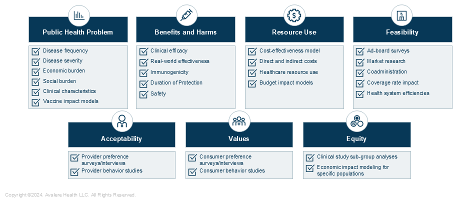 - Benefits and Harms: This domain relies on manufacturer data on a product’s clinical and safety profile. The ACIP has requested more robust data in specific higher-risk populations (e.g., immunocompromised individuals, comorbid populations, older adults). To meet requests, manufacturers can consider: (1) expanding clinical trial enrollment to recruit diverse populations, (2) stratifying trial results to better define and characterize high-risk populations groups, and/or (3) planning real world evidence studies to further understand vaccination in populations with unmet clinical need.
