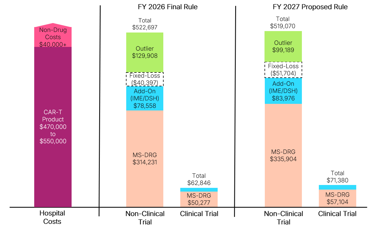 CMS reimburses CAR-T clinical trial cases, which do not incur drug costs, at a lower rate than non-clinical trial cases. Using its standard approach, CMS proposed an adjustment factor of 0.17 to the relative weight of MS-DRG 018 in FY 2027, for a base rate of $57,104. This would be a 13.6% increase over the current clinical trial payment rate (using an adjuster of 0.16). Therefore, if finalized, hospitals will receive higher payments for CAR-T cases when provided as part of a clinical trial at the beginning of the new fiscal year.