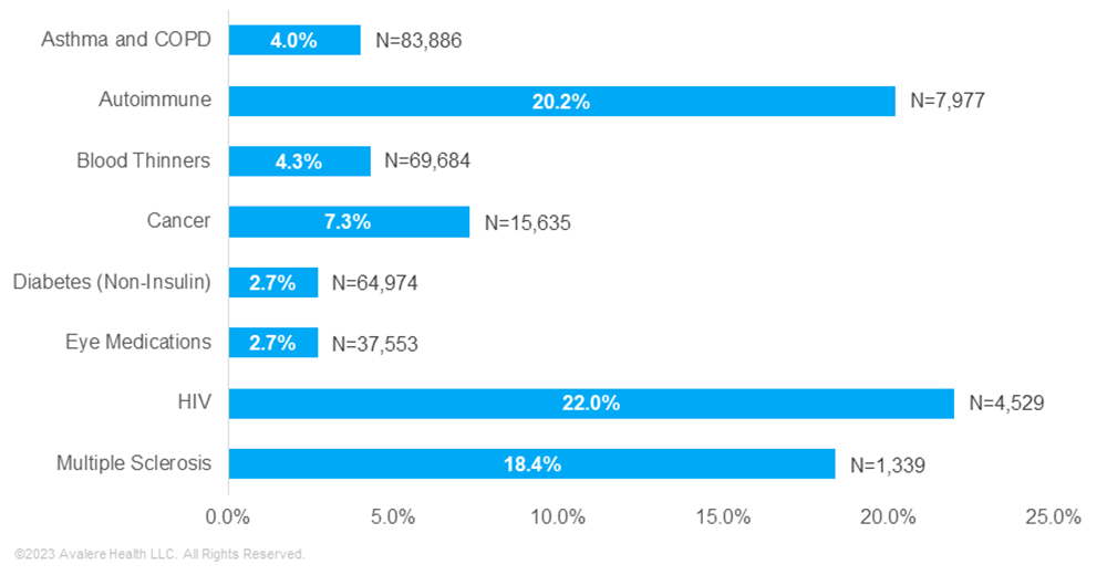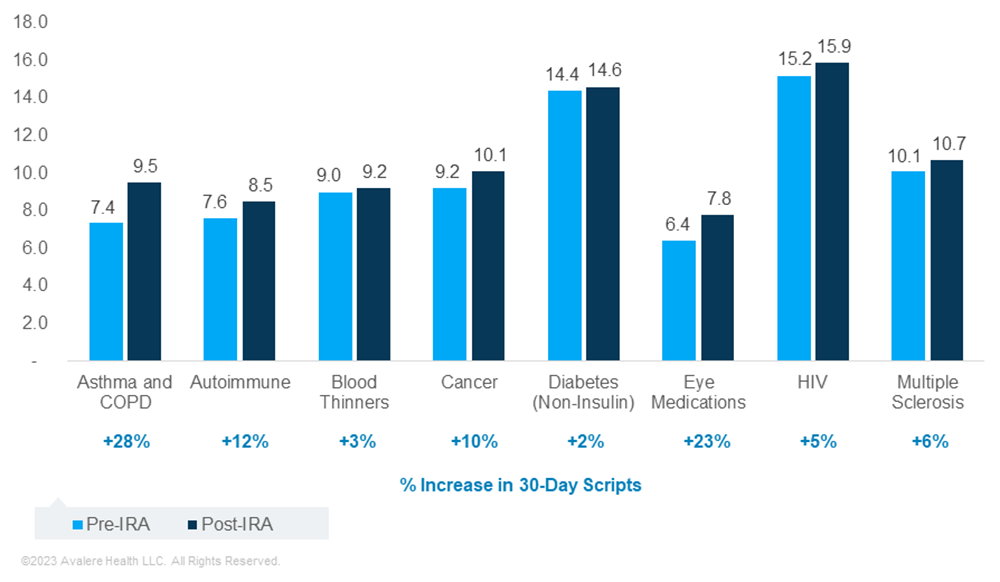 Based on current beneficiary utilization and spending patterns, Avalere estimates that anywhere from 6% (MS) to 86% (autoimmune) more beneficiaries will be on therapy across the analyzed TAs as a result of patients newly starting treatment under the IRA.