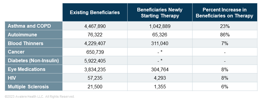 *Data on beneficiaries newly initiating therapy for cancer and non-insulin diabetes medications were inconclusive based on historic analysis of beneficiary utilization and spending patterns. As such, Avalere did not assume any changes in beneficiaries newly starting treatment in either of these TAs for this analysis.