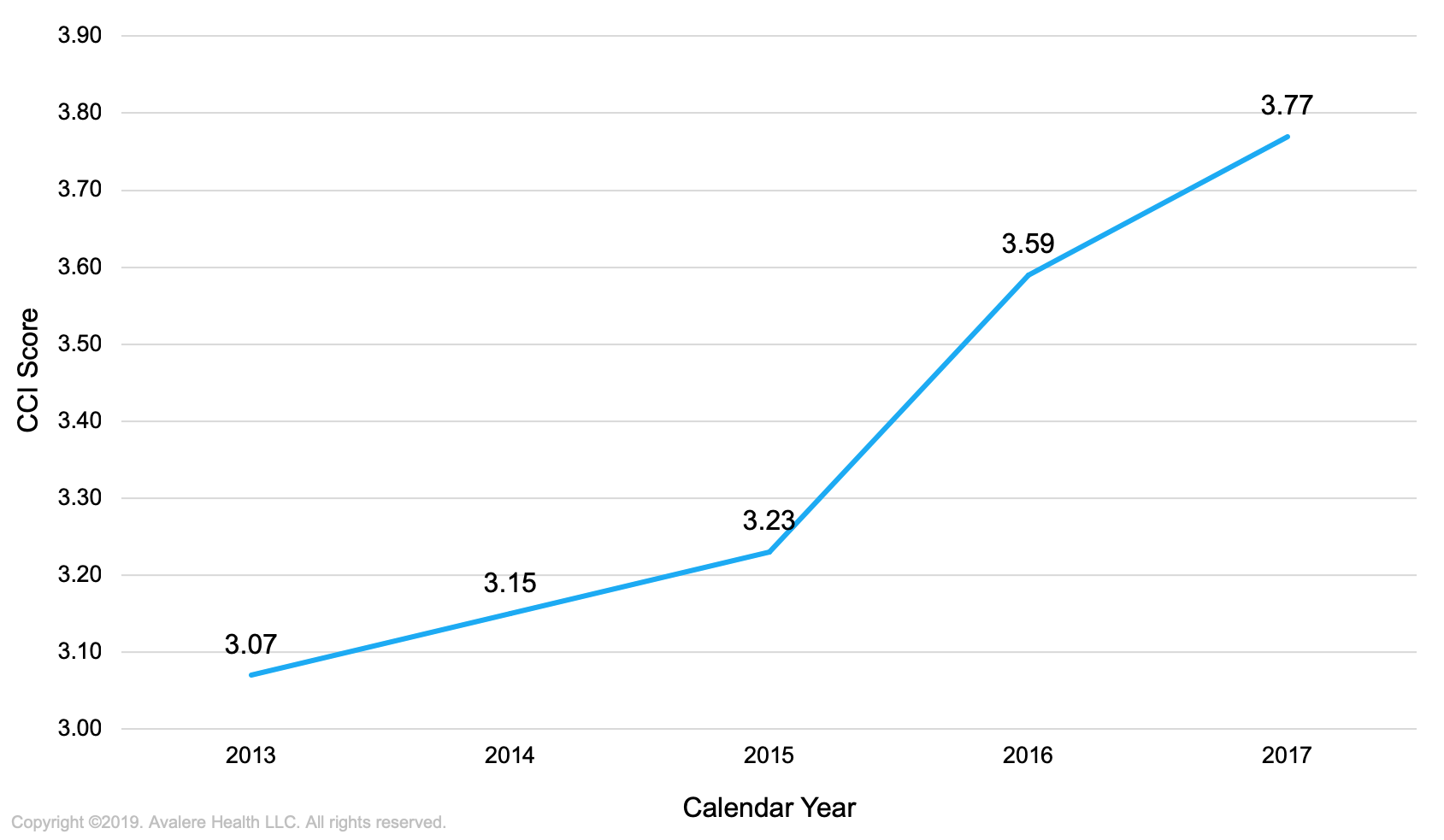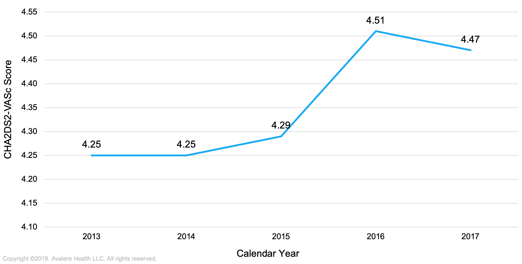 - The mean Charlson Comorbidity Index (CCI) score and CHA2DS2-VASc score increased for DOAC users from 2013–2017 (Figures 2 and 3)