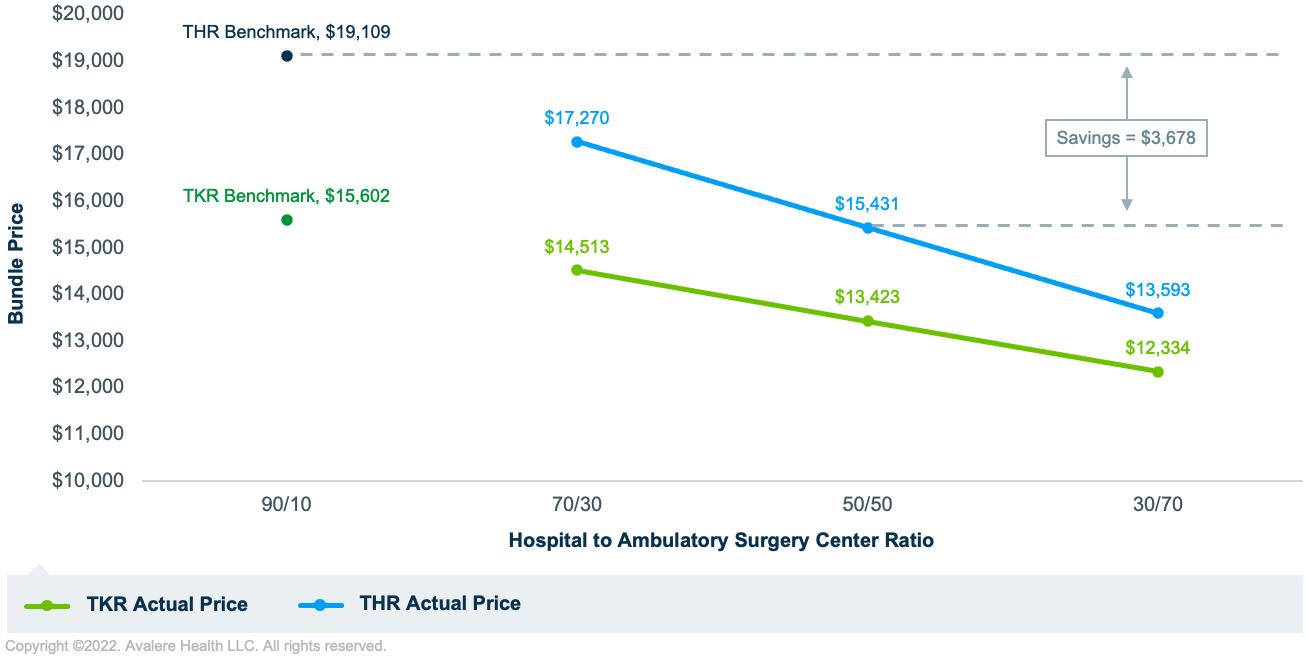 - In a same-day bundle for Medicare patients in the orthopedic practice of interest, shifting the ratio of THRs in an ambulatory surgery center (ASC) from 10% to 50% results in a price reduction of more than $3,500 per THR. (See Figure 2 below for the impact of site of service shifts on TKR and THR episode revenue in the Medicare population.)