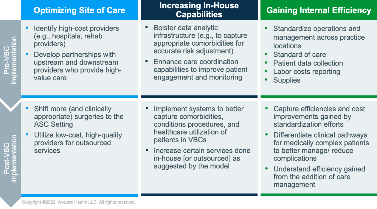 Orthopedic practices can utilize models built on claims data to simulate VBC performance by comparing a benchmark price of a certain VBC bundle to the potential bundle price with forecasted changes to site of service, PAC costs, and gained efficiencies, among others. The difference between the benchmark and the modeled bundle price represents the savings—or potentially losses—realized by the practice given the modeled changes. This activity informs the most impactful changes a practice can make to improve performance in a VBC. Figure 3 provides a framework for potential actions a practice can take to realize success in VBCs, which may be applied to other surgical specialties in the future.