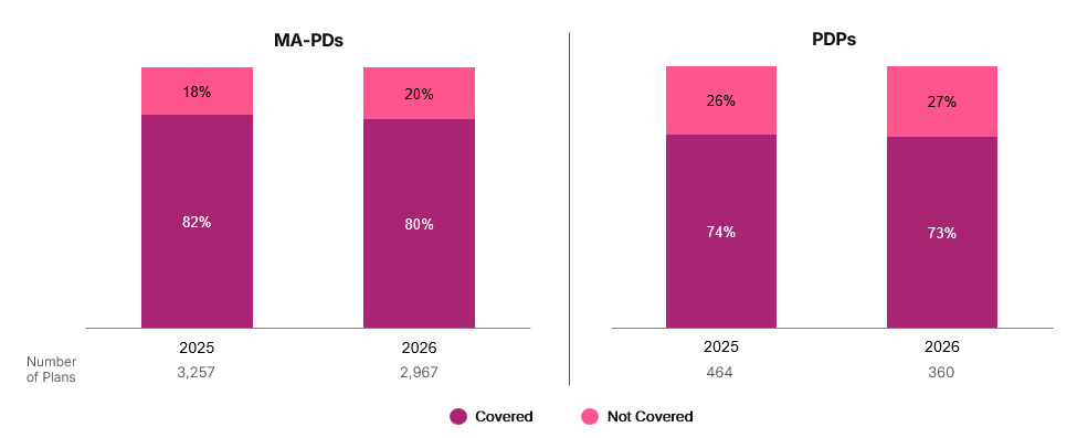 By contrast, coverage for the top 100 generic drugs by Part D spending rose for both PDPs (84% to 85%) and MA-PDs (88% to 89%) between 2025 and 2026.
