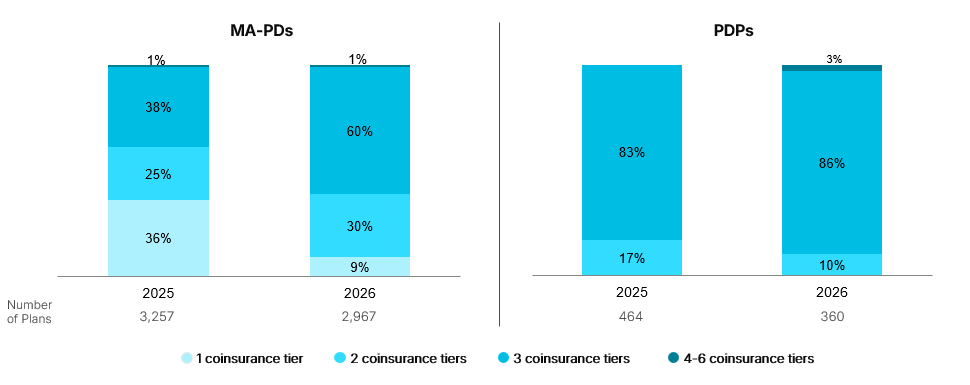 Most covered drugs are now placed on coinsurance tiers for both PDPs and MA-PDs. The average share of all drugs on coinsurance tiers is increasing from 48% in 2025 to 63% in 2026 for MA-PDs and from 76% to 79% for PDPs. Since 2023, the average percentage of all drugs covered on coinsurance tiers has increased by 35 percentage points for MA-PDs and 14 percentage points for PDPs.