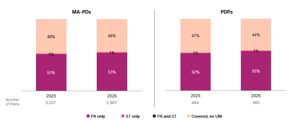 Figure 3. Average Percentage of Covered Brand Drugs by Utilization Management Tool Among MA-PDs and PDPs, 2025 vs. 2026