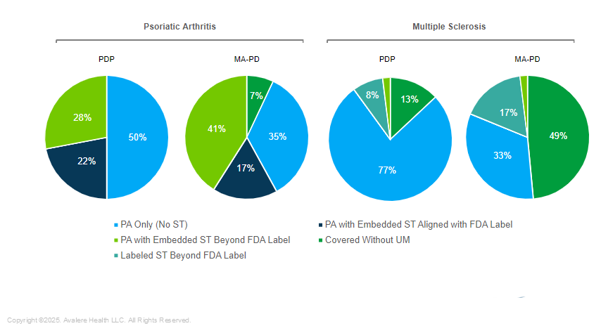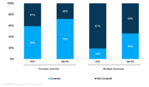 This analysis evaluates 2023 data in standalone Medicare Prescription Drug Plans (PDPs) and Medicare Advantage Prescription Drug Plans (MA-PDs) for branded, single source drugs indicated to treat PsA and MS.