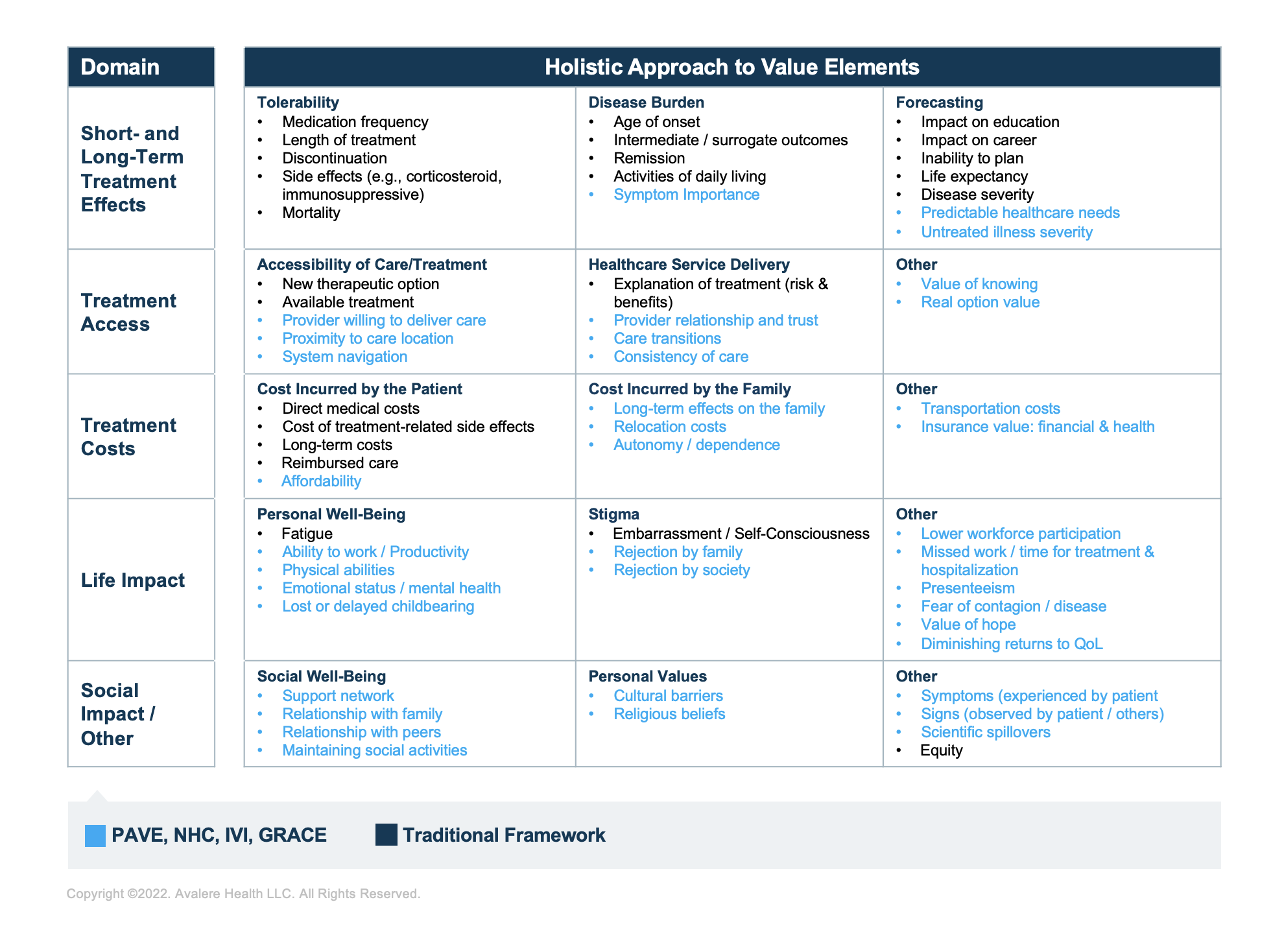 The last decade has ushered in these new conceptual frameworks, referred to as “patient-centric” frameworks in this white paper, that incorporate additional variables more directly tied to overall societal benefit and the patient’s perspective (e.g., equity, cultural barriers, societal spillovers, value of hope, fear of contagion or disease). Examples of these models include the ISPOR Value Flower, the Generalized Risk-Adjusted Cost-Effectiveness (GRACE) approach, the Patient-Driven Values in Healthcare Evaluation (PAVE) model, the Innovation and Value Initiative (IVI), and the Patient-Centered Core Impact Sets (PC-CIS).