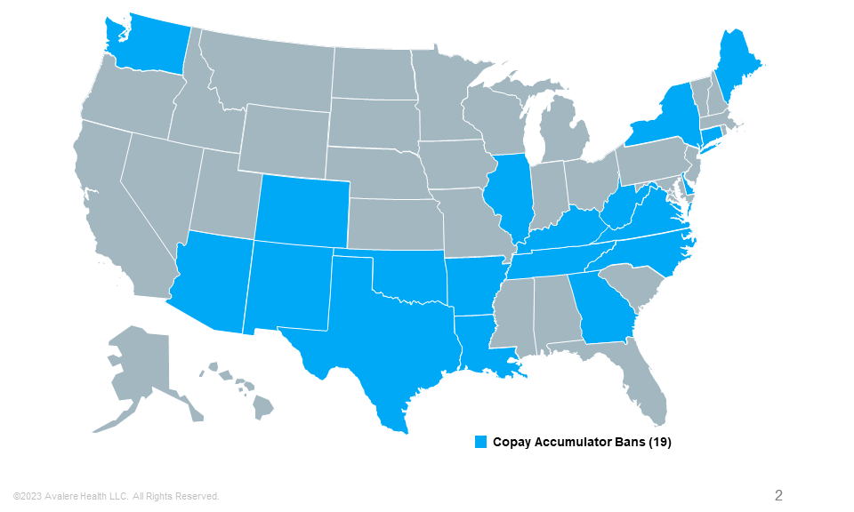 Over the past several years, state legislators have passed bills aimed at banning the use of copay accumulator programs and ensuring that any third-party copay assistance used by a patient is counted toward the cost-sharing limits of that patient’s plan. As of June 2023, 19 states have enacted laws banning payer and PBM use of copay accumulator programs. These laws apply to state-regulated health plans, including the individual, fully insured large-group, and small-group markets. As of January 1, 2024, at least 19% of the total US commercial market—26.46 million individuals—will be enrolled in plans that must count any form of copay assistance toward patient cost-sharing limits. Additional states may enact laws as they wrap up their 2023 state legislative sessions, increasing this number.