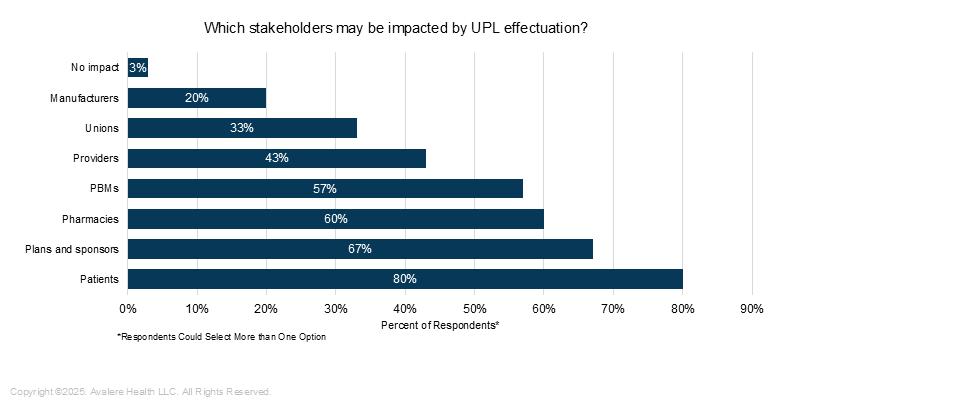 When asked which types of stakeholders may be most impacted by UPL effectuation, 80% of respondents selected patients—the highest out of all stakeholders listed (Figure 1).