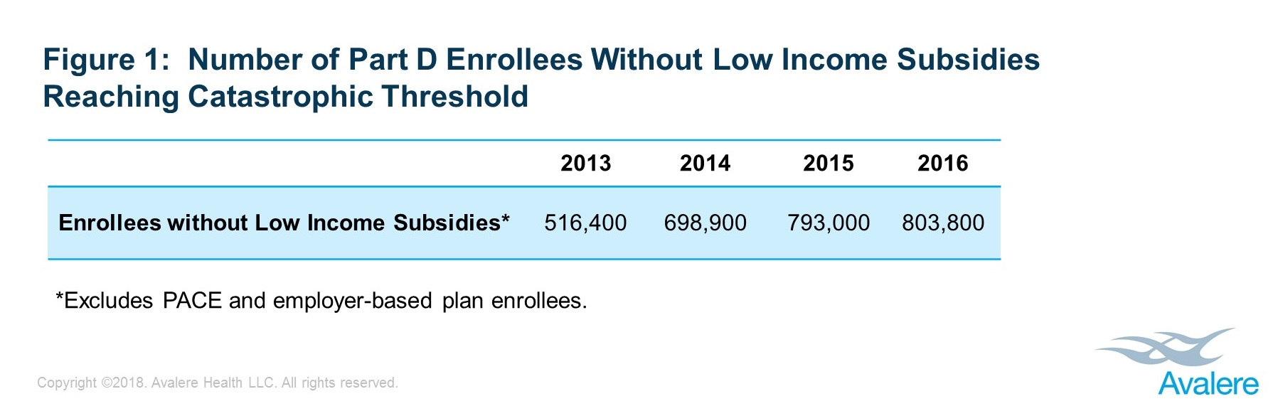 Patient out-of-pocket costs continue to grow despite policies to increase affordability for beneficiaries.New analysis from Avalere finds that the number of Medicare prescription drug plan (Part D) beneficiaries who reach the catastrophic coverage phase of the benefit increased by more than 50% from 2013-2016. In 2016, more than 800,000 Medicare Part D enrollees without low-income subsidies (LIS) entered the catastrophic coverage phase, compared to approximately 515,000 in 2013 (Figure 1).