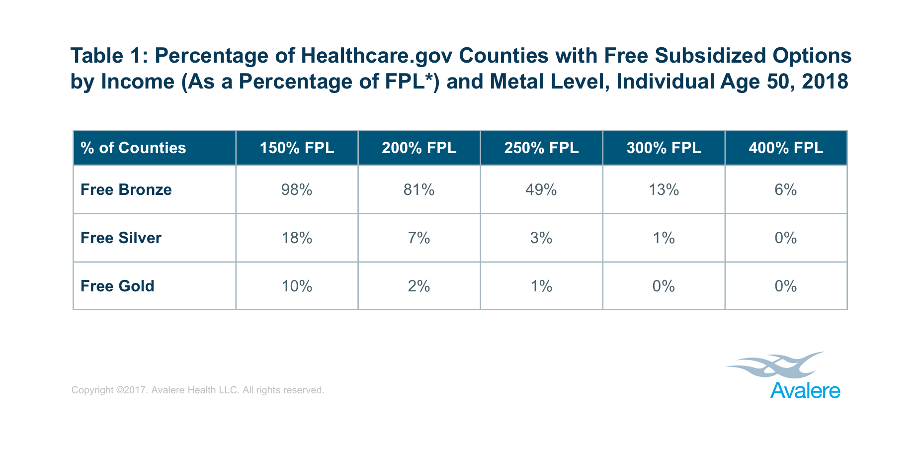 To conduct the analysis, Avalere utilized the recently released 2018 Individual Market HHS Landscape Files of 2018 exchange plan premiums in Healthcare.gov states. Avalere then calculated the expected advance premium tax credits (APTCs) in each of the 2,722 counties, by income, for a 50-year-old non-smoker, using the second-lowest silver plan in each region. That subsidy amount was then applied to every bronze, silver, gold, and platinum plan in counties served by Healthcare.gov to determine the number of “free” plans available to subsidized consumers of different income levels. Avalere used the most up to date IRS determinations of subsidy eligibility and the 2017 Federal Poverty Level Guidelines for all states. Additionally, Avalere used the Alaska-specific and Hawaii-specific federal poverty guidelines for the analysis of Alaska’s and Hawaii’s health plans.