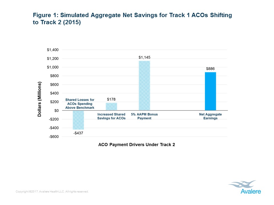 Using ACO performance data under the MSSP in 2015, Avalere experts simulated how Track 1 (non-risk-bearing) ACOs would have performed if they had assumed risk under the Track 2 ACO model (two-sided risk) and were eligible for a 5% AAPM bonus payment. Avalere’s analysis found that most ACOs would have financially benefited from bearing risk—79% (307) of Track 1 ACOs would have financially benefited versus 21% (82 ACOs) that would have generated net losses overall.