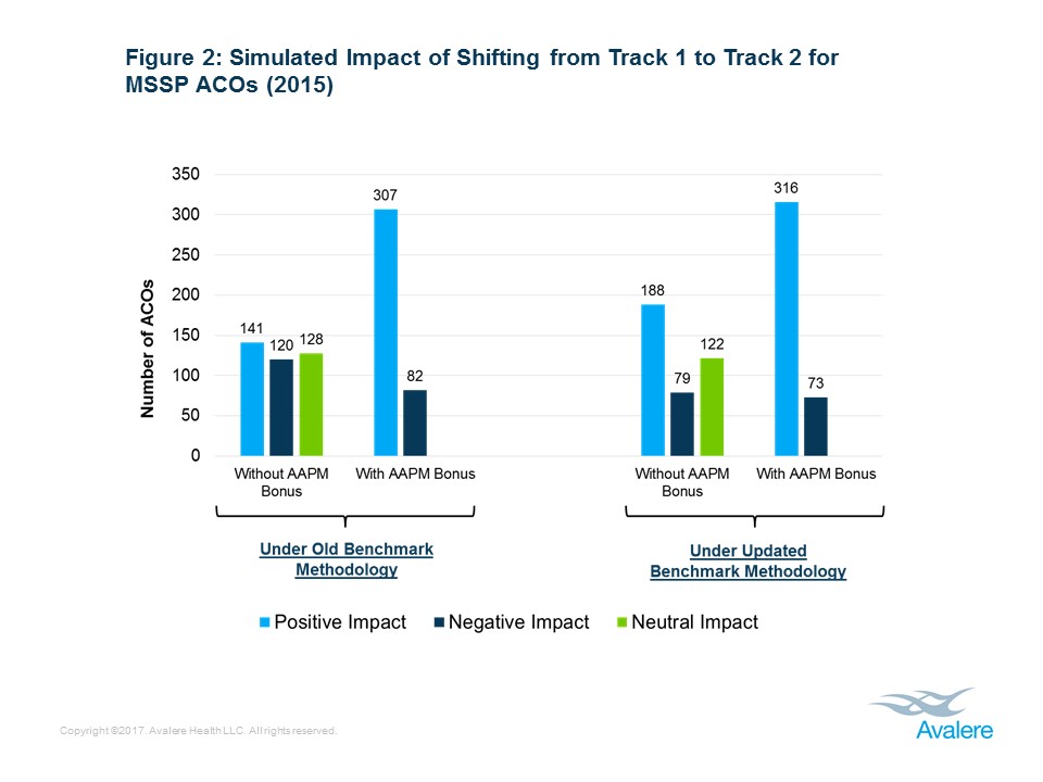 Analyzing ACO performance data under the MSSP in 2015, Avalere simulated how non-risk-bearing (Track 1) ACOs would have performed if all of them had instead taken on risk under the Track 2 ACO model and were eligible for the AAPM bonus payment. Analysis includes 389 ACOs participating in the Medicare Shared Savings Program (MSSP) with performance data available in 2015 under Track 1 but did not include the three ACOs that were participating under Track 2.