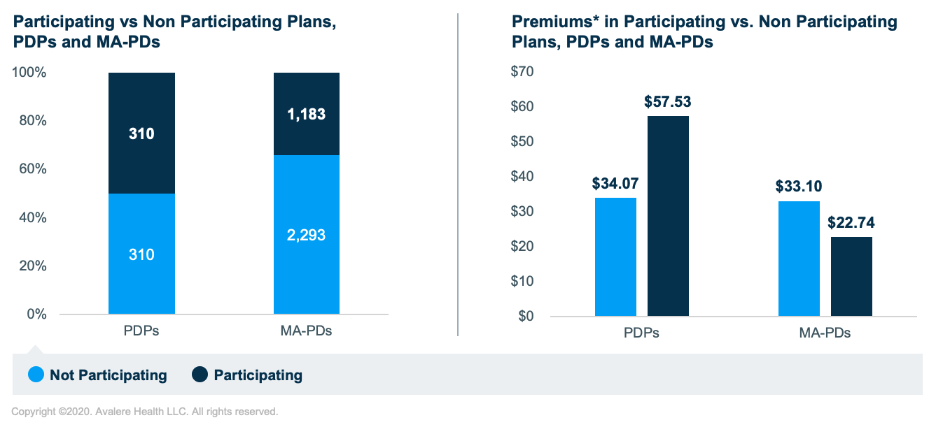 Premiums vary by plan type. The average enrollment-weighted monthly premium3 enhanced PDPs is $23.46 more for participating versus non-participating plans ($57.53 versus $34.07). For MA-PD plans, the average enrollment-weighted premium for MA-PD plans is $10.36 less for participating versus non-participating plans ($22.74 versus $33.10).